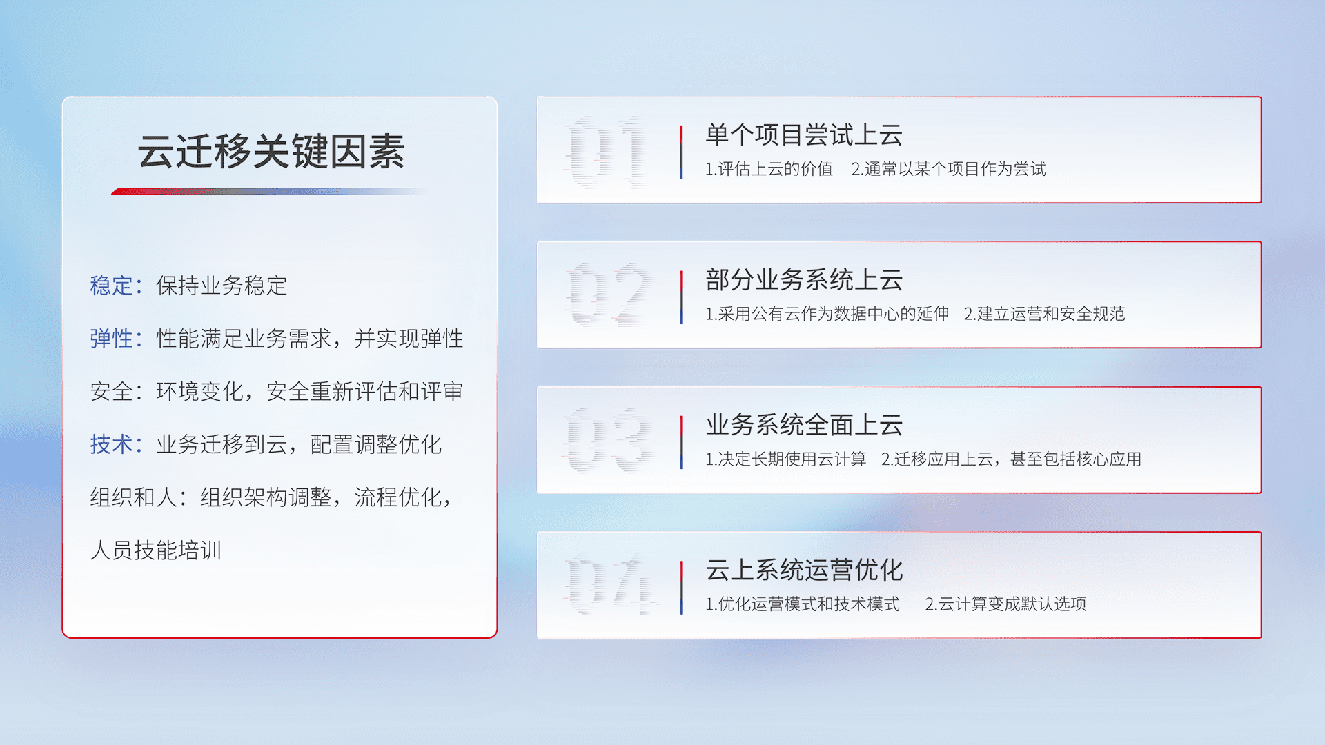 结合实际业务,,从规划设计、、云平台选型、、、、云原生改造、、、、数据迁移、、、、集成交付,,,迁移全过程为客户识别最佳上云路径,,,做好风险识别管理,,设计网络架构、、、、身份权限、、安全审计合规、、、、操作审计、、、日志审计、、监控告警策略、、、多站点容灾设计等,,对云上基础设施进行整体规划,,提升IT治理水平,,,以满足弹性、、、高可用、、、、高性能的需求。。。。