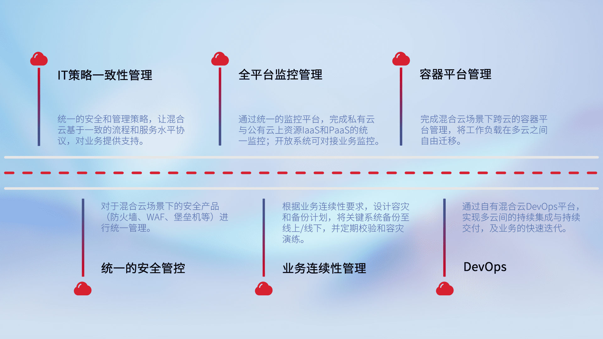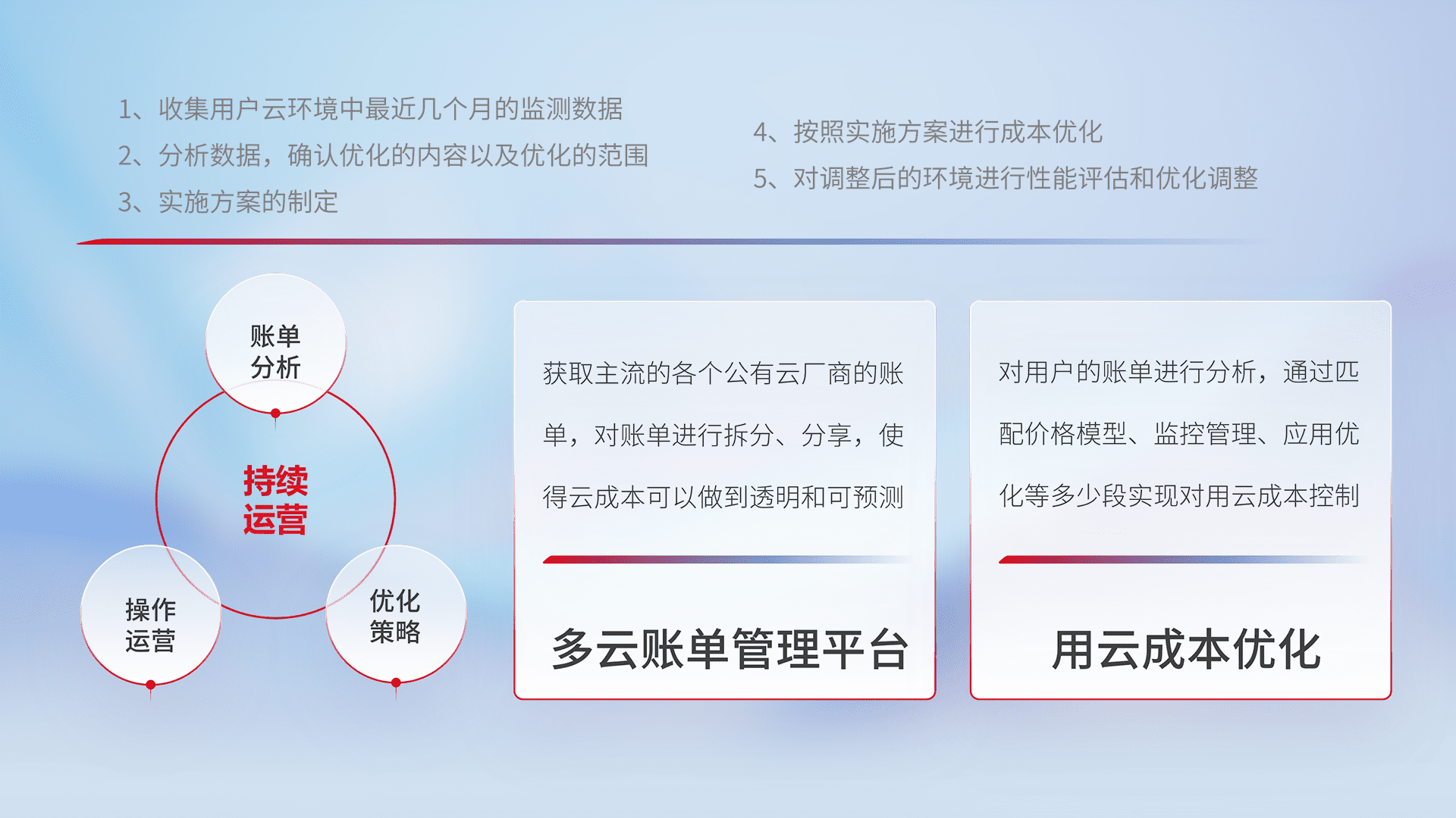 通过多云纳管,,,以统一的资源数据模型把客户的云资源进行抽象和封装,,,,进而实现对多云资源的统一操作,,,,保障云资源管理的可靠性、、稳定性与可用性。。。。量身定制化运维内容,,,配置、、开发运维、、、补丁管理、、、备份、、、监控、、、、认证和访问管理、、、、审计和日常巡检等,,,保障在用云过程中的可靠度,,,,稳定度以及高可用率。。。。